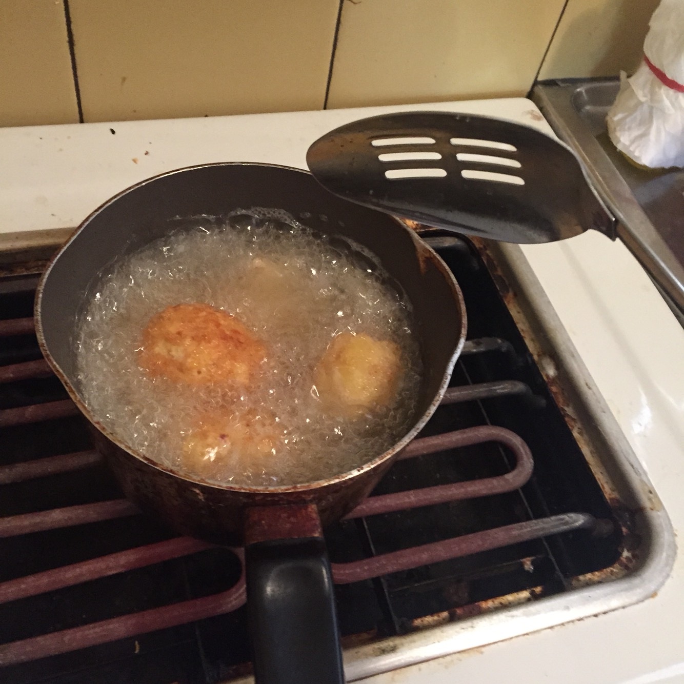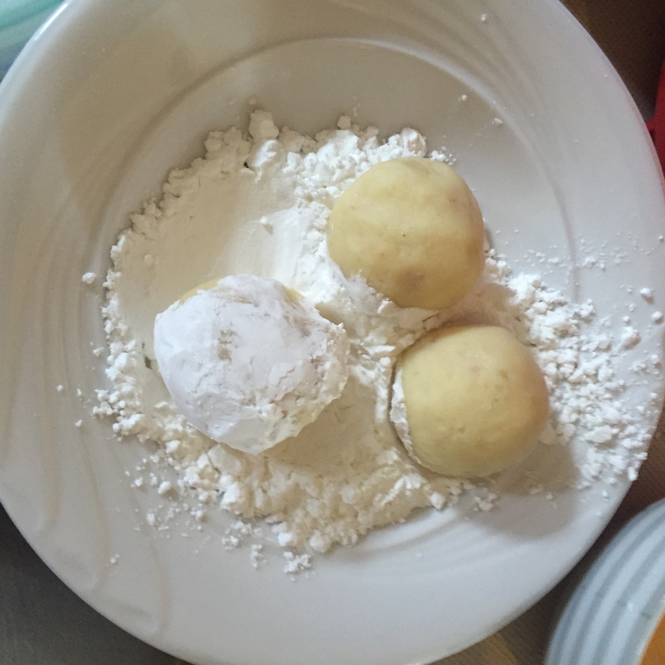 8. 用粟粉包裹薯球,沾蛋漿,再用麵包槺包