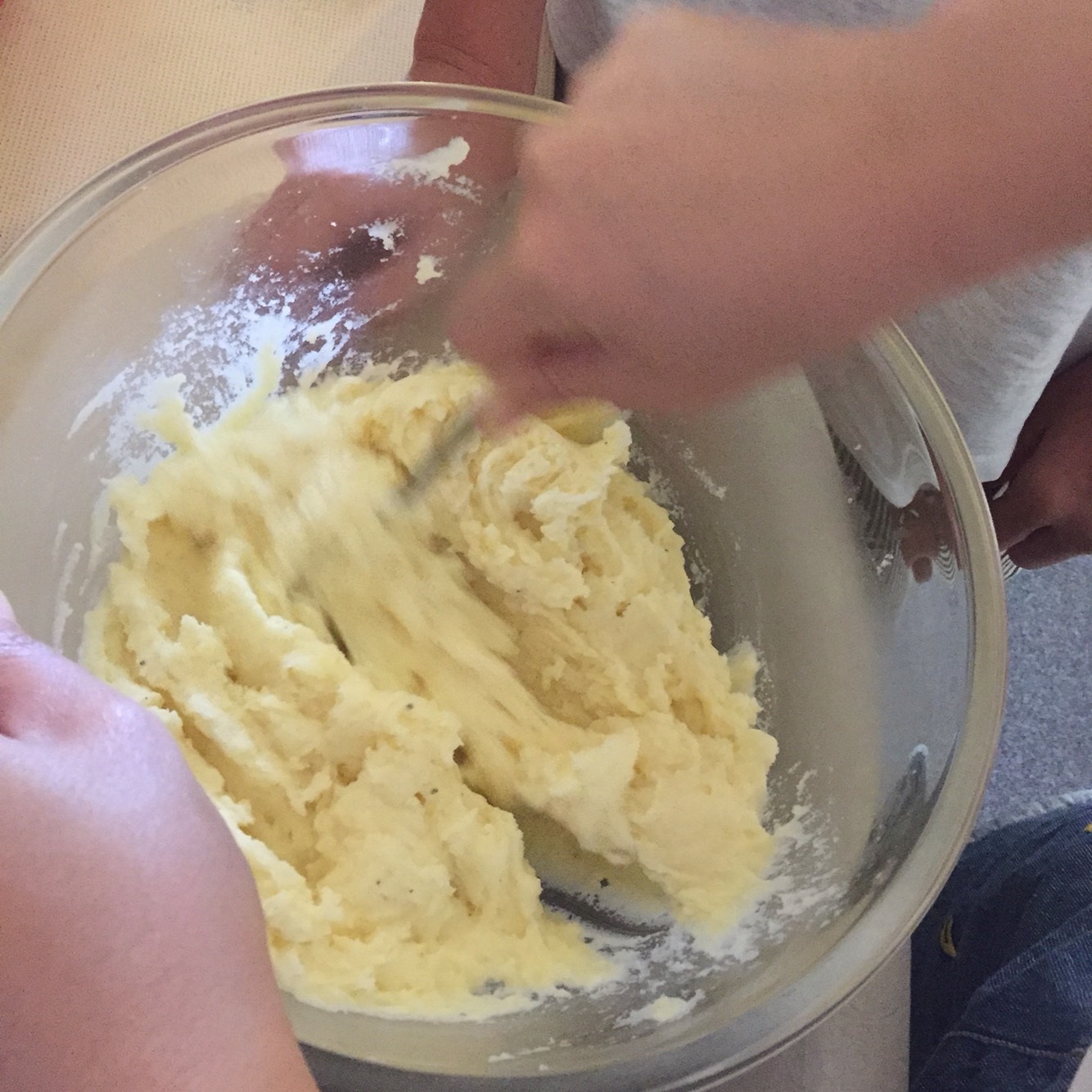 5. 將炒香了的洋蔥煙肉加入薯蓉攪勻
