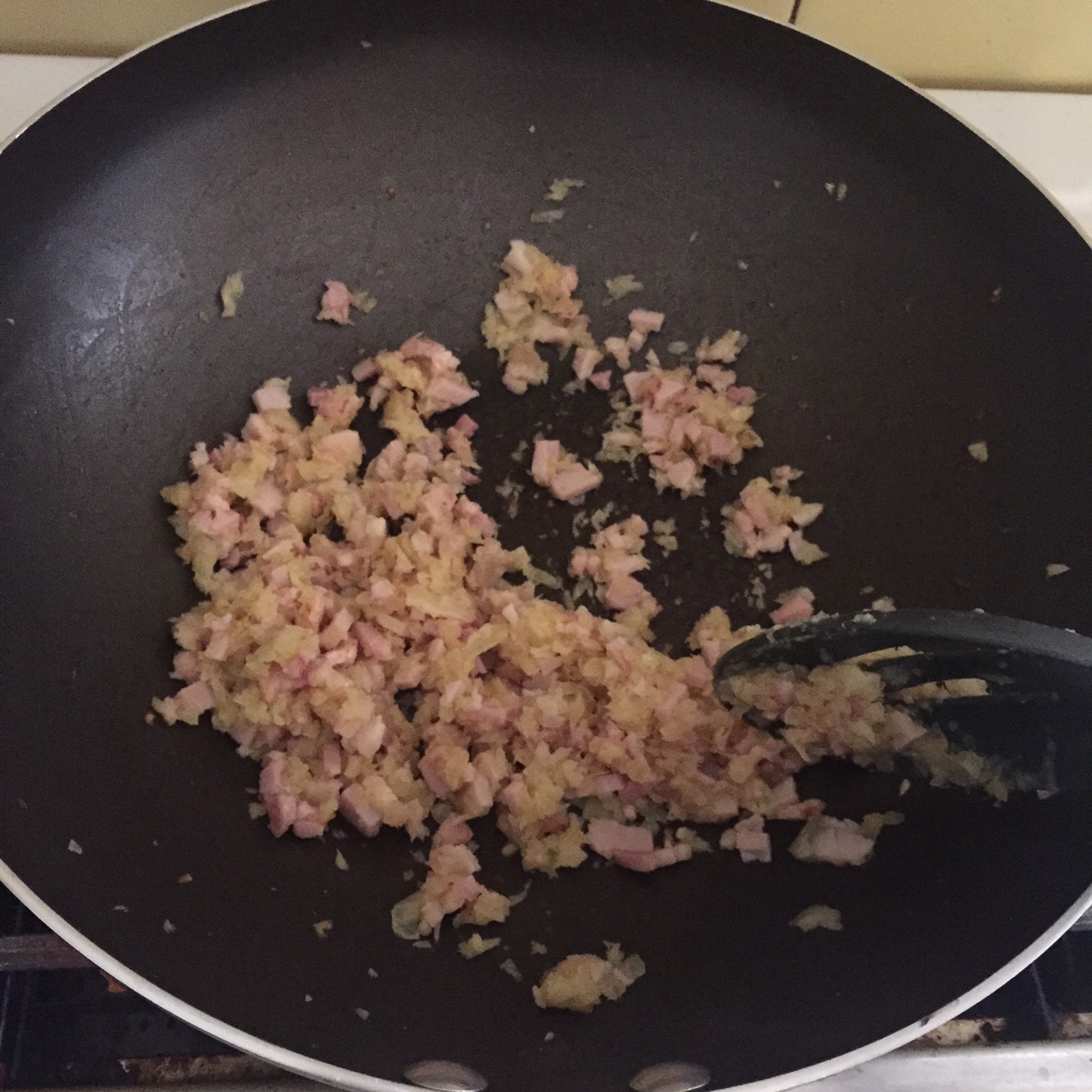 4. 洋蔥用牛油炒香,再落煙肉炒