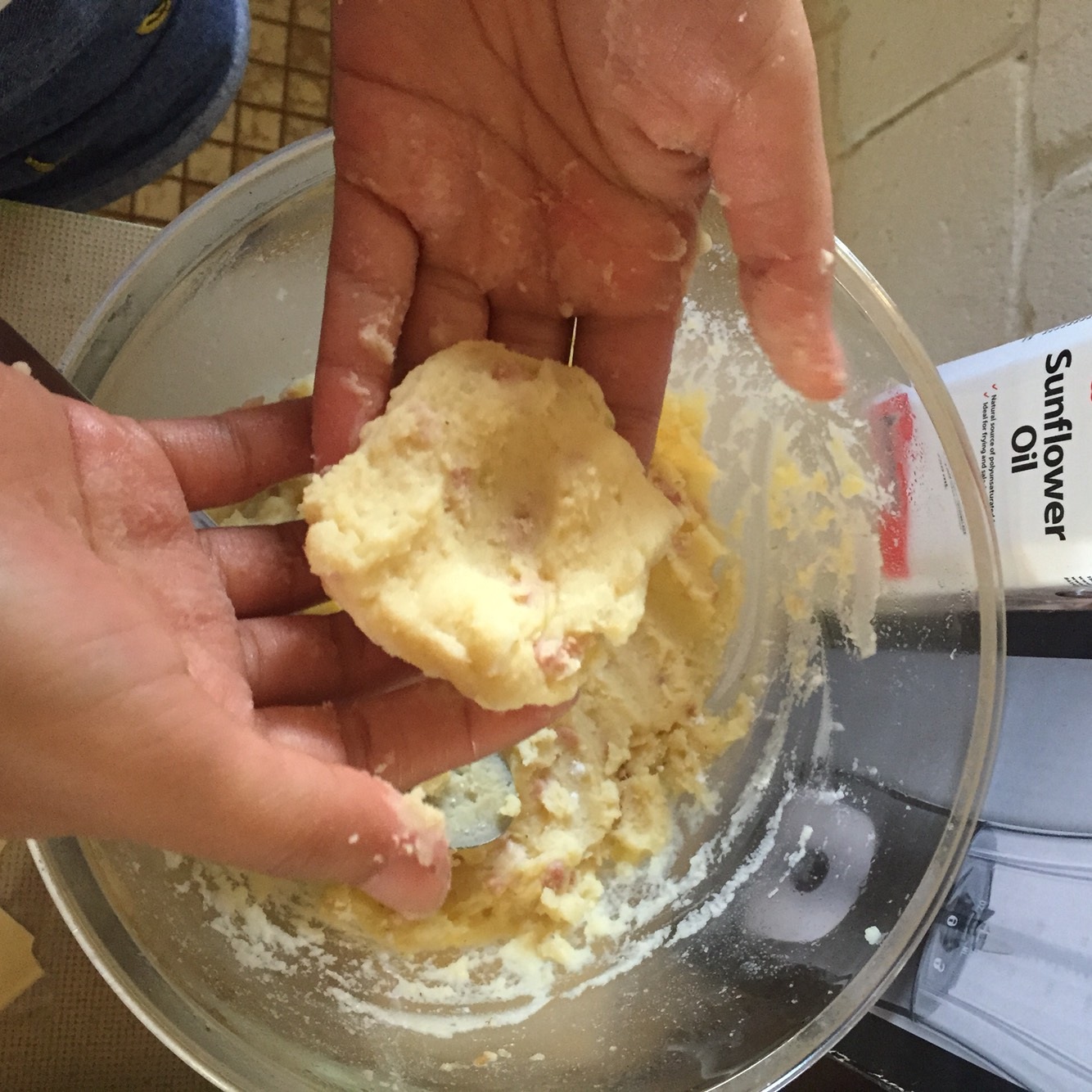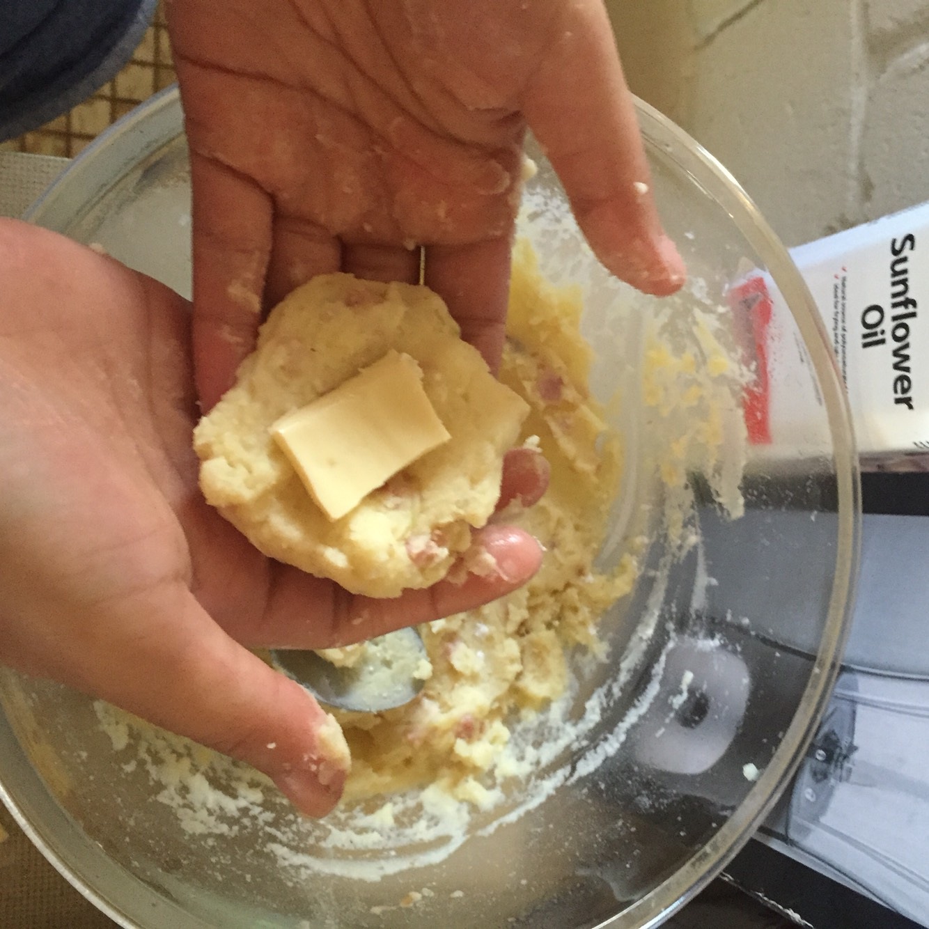 7. 拿適量薯蓉放手心,搓圓然後壓平 中間放芝士然後再搓圓