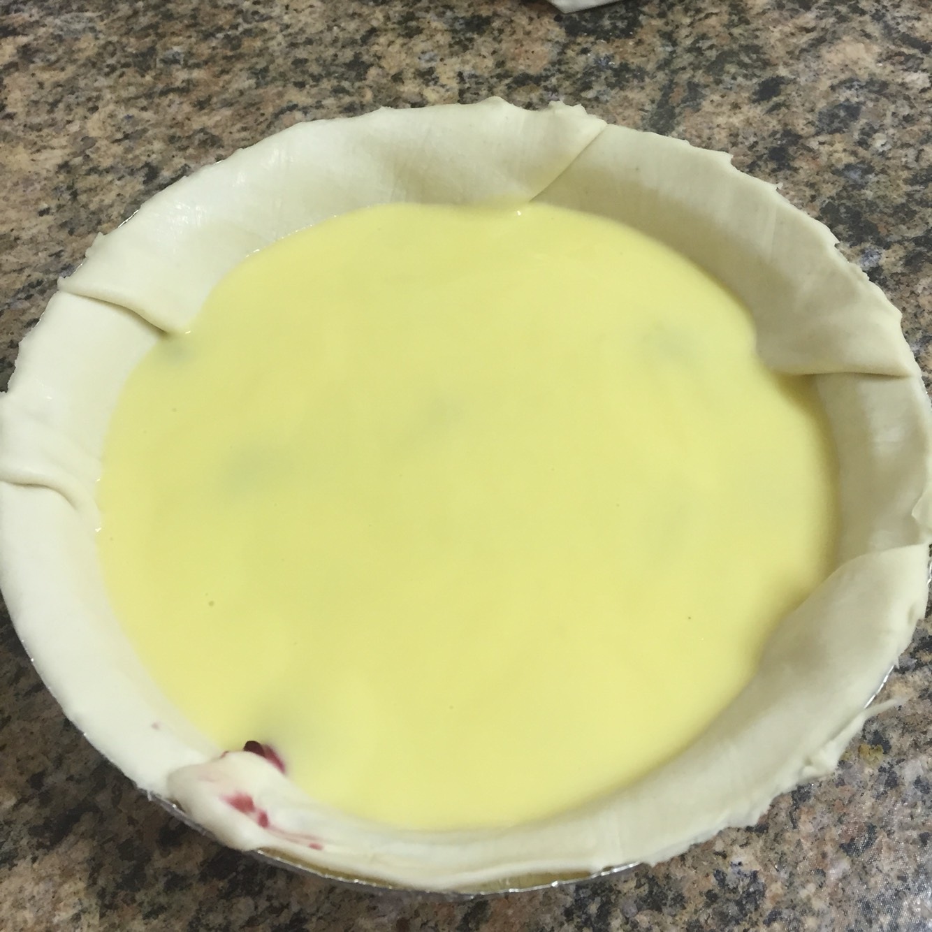6. 預熱焗爐、由雪櫃取出模後倒入吉士醬,份量完全蓋過櫻桃醬就可以 太多切開時會流哂出黎